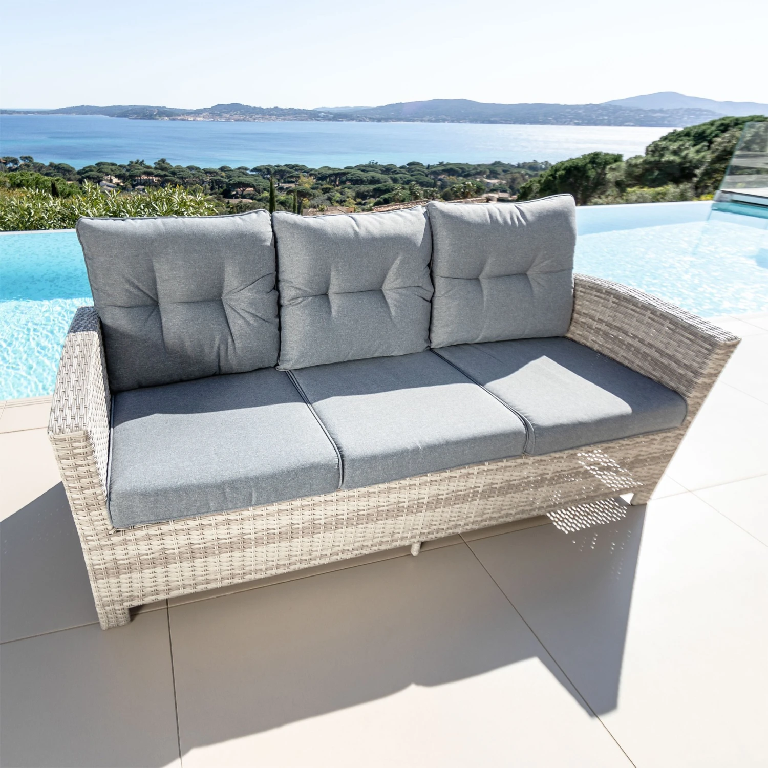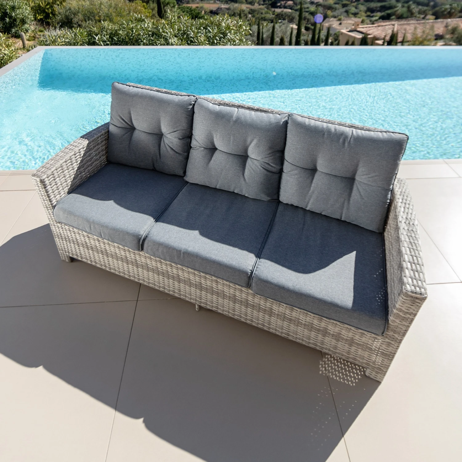 – Coussins déperlants et déhoussables : polyester (240 g/m²). Densité coussin d’assise : 24 kg/m³.