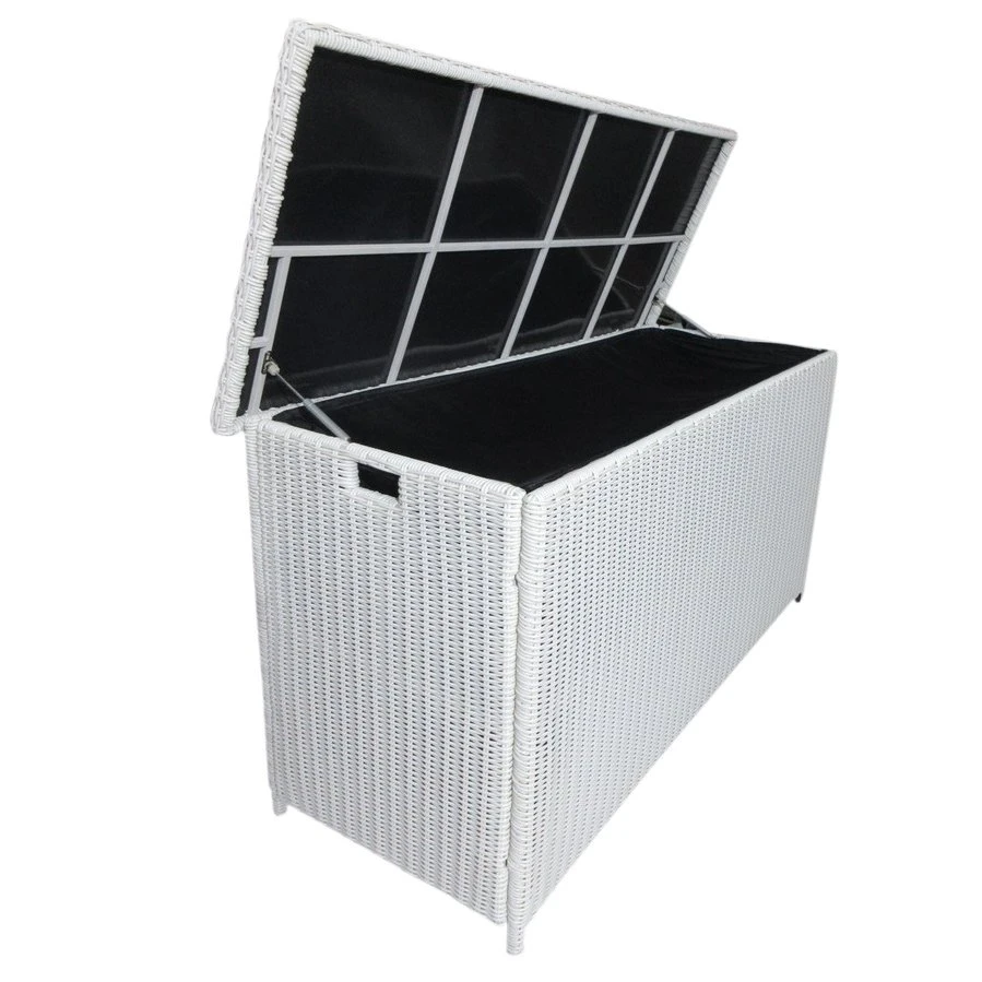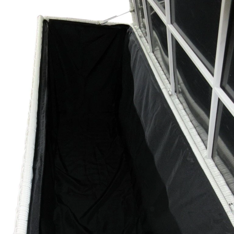 Grâce à la grande capacité de ce coffre, vous allez pouvoir ranger tous les coussins de votre salon de jardin Calvi 7 places. De plus, son panneau en plastique et sa housse en polyester entièrement refermable, empêcheront l’eau de s’inflitrer. Pratique, il est muni de roulettes, d’une poignée sur le côté et s’ouvre sur le dessus.