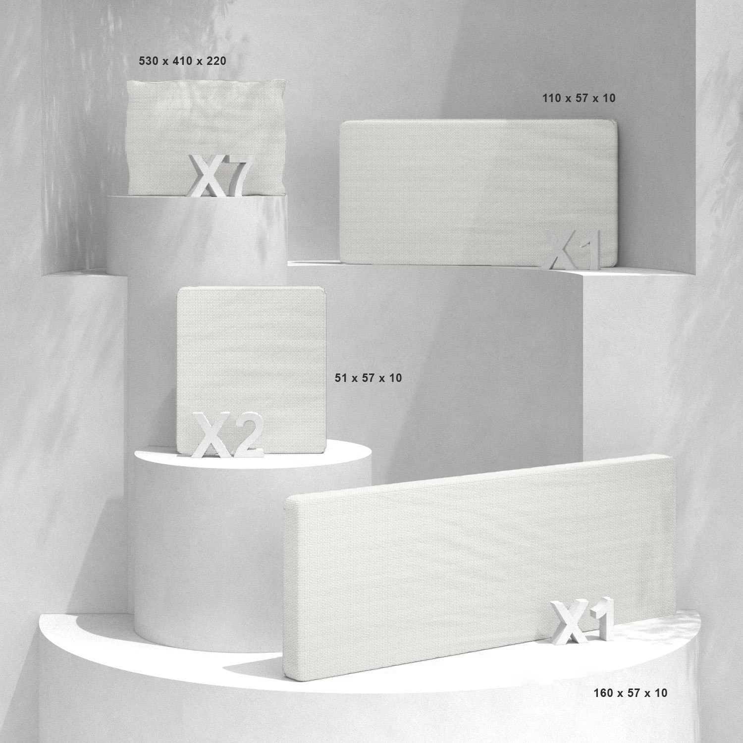 Il comprend : 2 coussins d’assise de fauteuil, 1 coussin d’assise pour le canapĂ© 2 places, 1 coussin d’assise pour le canapĂ© 3 places et 7 coussins de dossier.