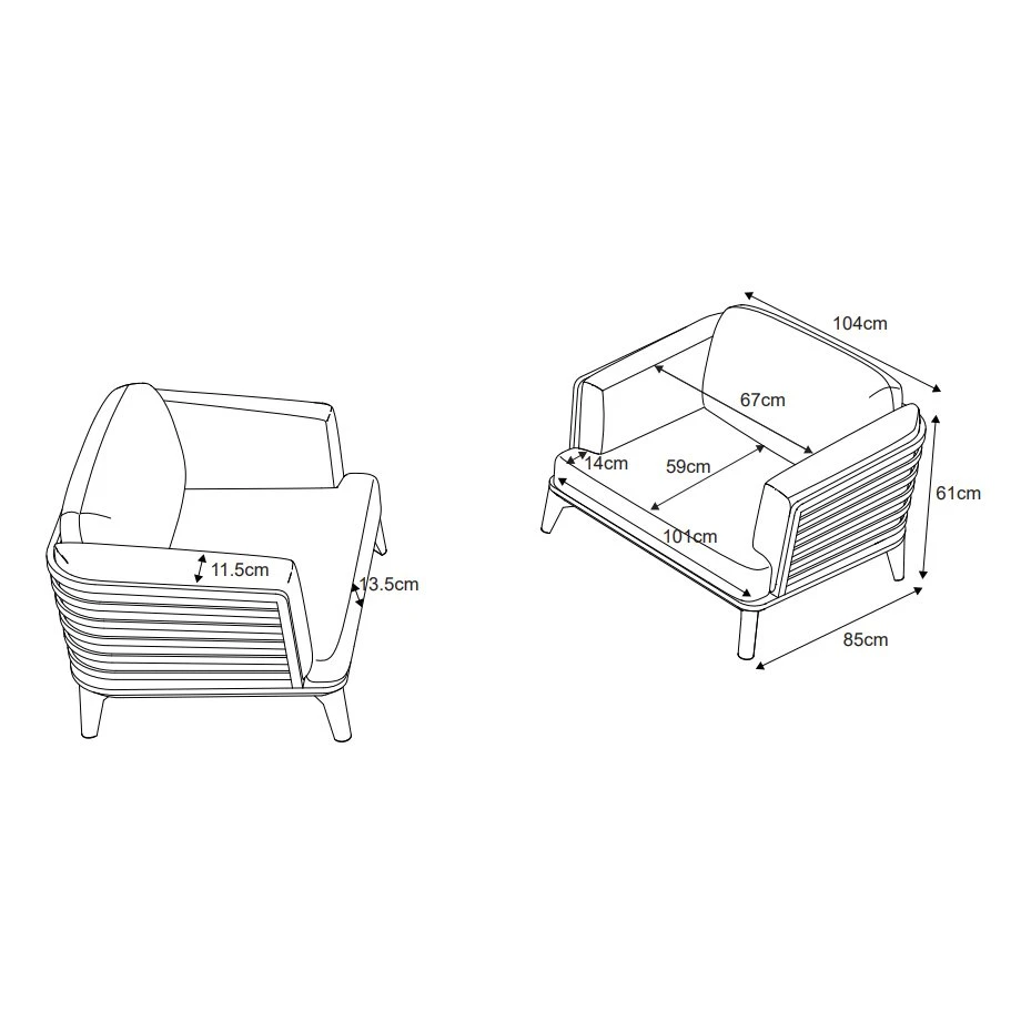 – Coussin d’assise : longueur 101 x largeur 89 x Ă©paisseur 14 cm.