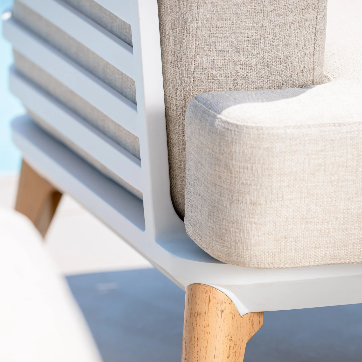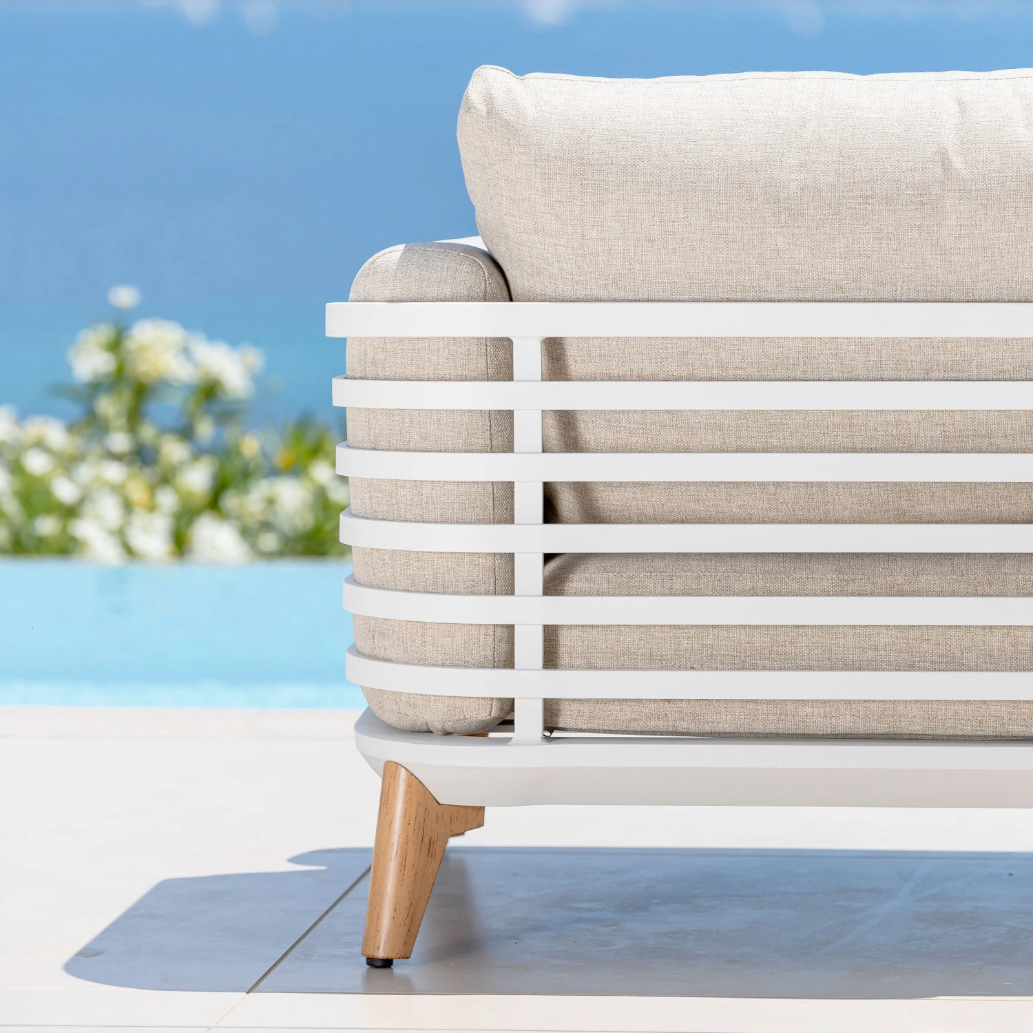 Couleur : structure blanche, pieds imitation bois et coussins taupe.