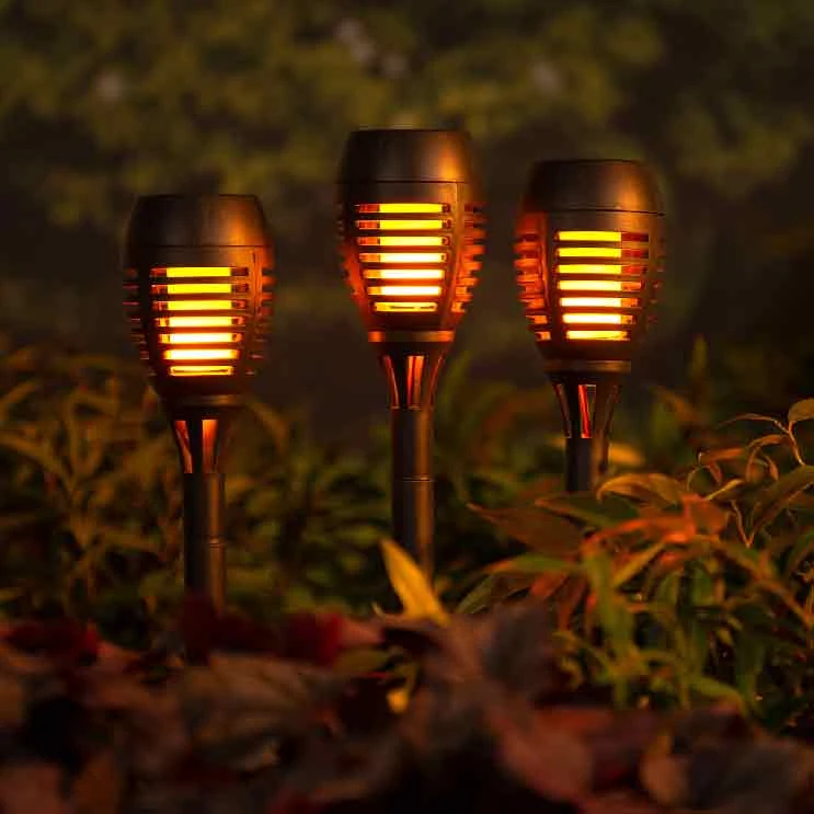 Ces torches de jardin reproduisent le scintillement des flammes pour créer une ambiance exotique dans votre jardin. Grâce à son fonctionnement à l’énergie solaire profitez de 6 heures d’éclairage sans aucun branchement. Les torches s’allument automatiquement à la tombée de la nuit et s’éteignent une fois la batterie solaire déchargée après environ 6h de fonctionnement.