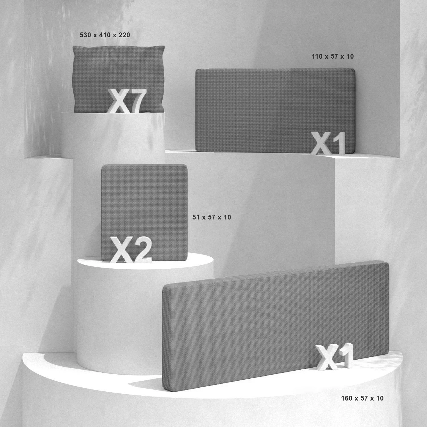 Il comprend : 2 coussins d’assise de fauteuil, 1 coussin d’assise pour le canapé 2 places, 1 coussin d’assise pour le canapé 3 places et 7 coussins de dossier.