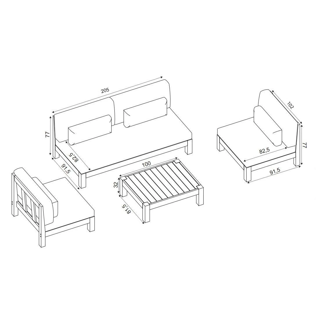 – Coussins d’assise fauteuil : longueur 103 x largeur 85,5 x épaisseur 13 cm.