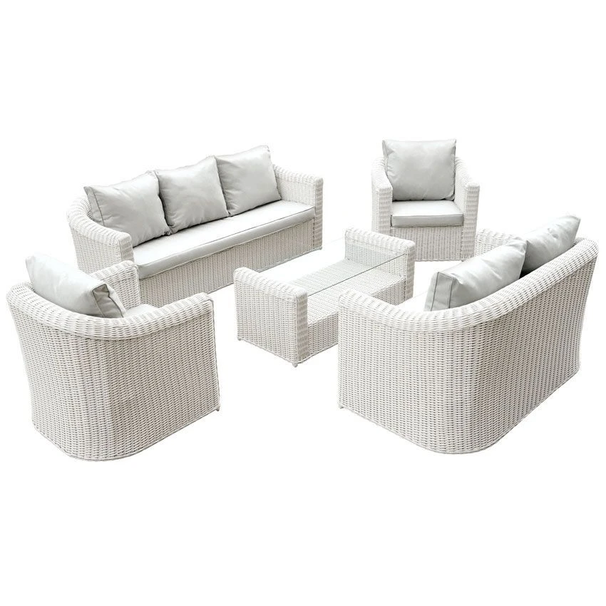 Il comprend : un canapé 3 places, un canapé 2 places, deux fauteuils avec accoudoirs et une table basse. Tous les coussins sont inclus.