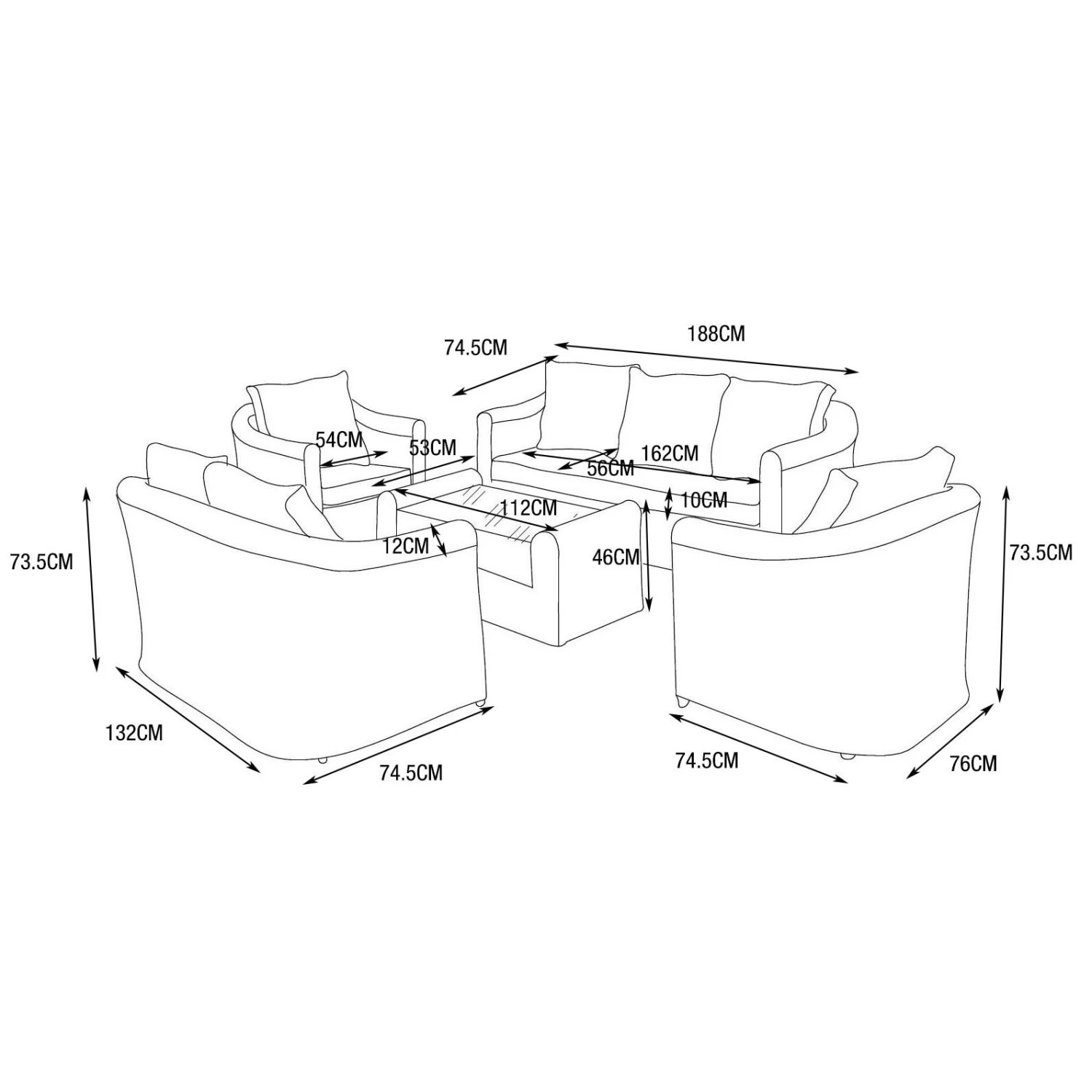 – Fauteuils avec accoudoirs : longueur 77 cm x profondeur 75 cm x hauteur 75 cm.