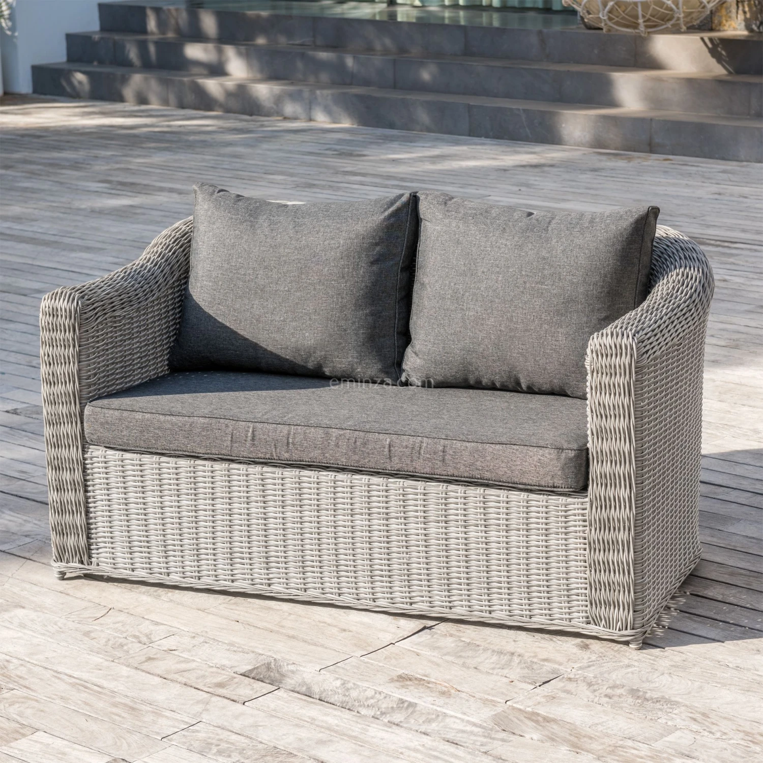 Couleur : gris et coussins gris foncés.