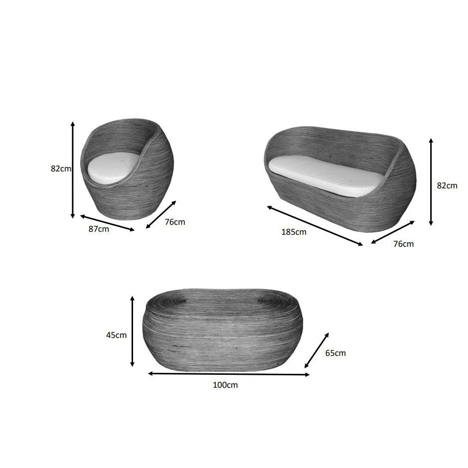 – Canapé 3 places : longueur 185 cm x profondeur 76 cm x hauteur 82 cm.