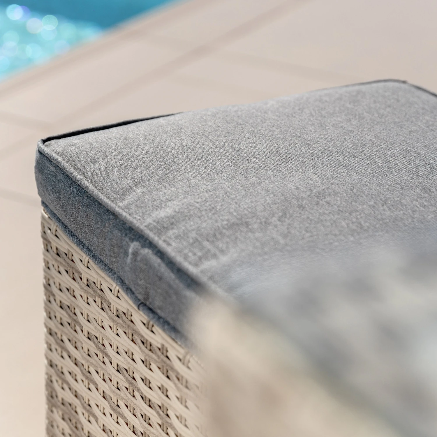 – Coussins : déperlants en polyester (220 g/m²). Densité coussin d’assise : 24 kg/m³.