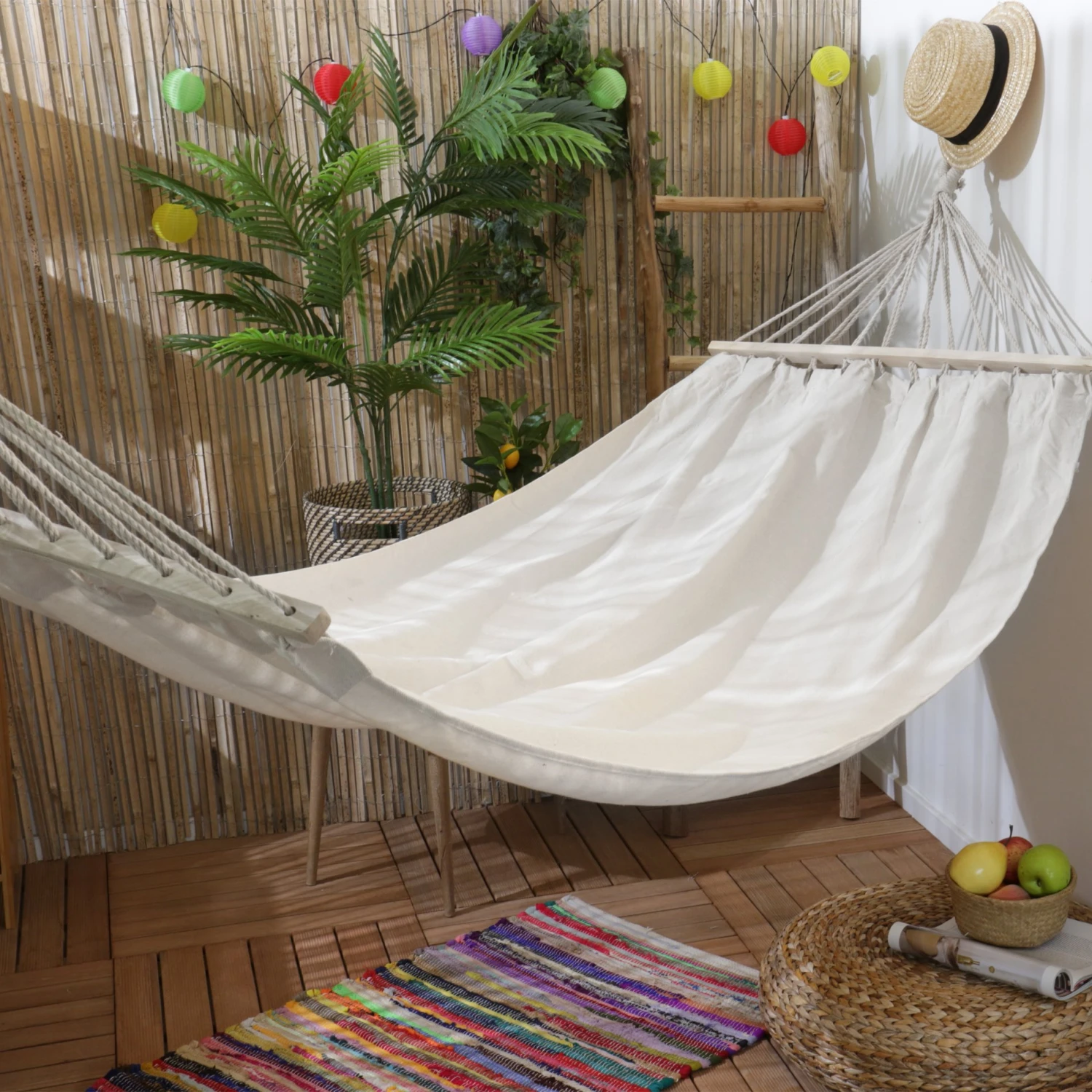 Lové(e) dans ce hamac, profitez des siestes estivales ! Ses cordes d’accrochage répartissent parfaitement la charge et garantissent votre confort.